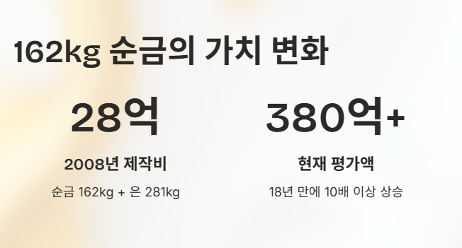 2008년 제작 당시 재료비는 약 28억 원 수준이었지만, 최근 금 시세 상승으로 현재 평가 가치는 380억 원을 훌쩍 넘는 수준으로 알려졌습니다.