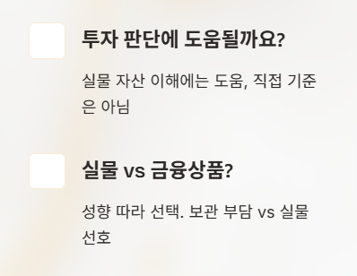 직접적인 투자 기준은 아니지만, 금이 ‘실물 자산’이라는 점을 이해하는 데는 도움이 됩니다.