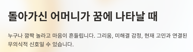 - 그리움과 애도: 평소 마음속에 남아 있는 어머니에 대한 감정이 꿈으로 나타납니다.