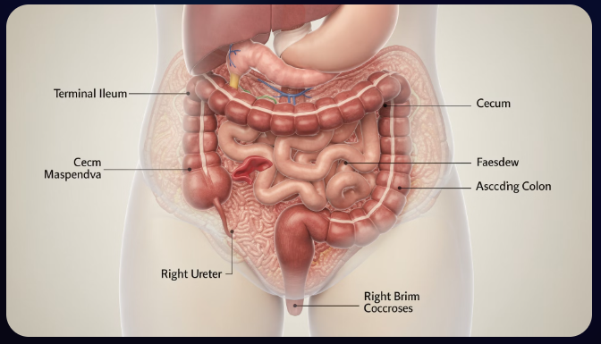 오른쪽 아랫배에는 맹장(충수), 회장 말단부, 요관, 여성의 경우 난소·나팔관, 남성의 경우 정관 일부가 위치합니다. 따라서 통증 원인은 크게 소화기계, 비뇨기계, 생식기계로 나뉩니다.