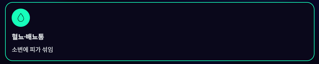 - 요로결석: 극심한 통증이 옆구리에서 하복부로 퍼지며 혈뇨 동반 가능