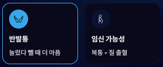 - 자궁외임신: 생리 지연 후 심한 하복부 통증과 출혈 → 응급상황