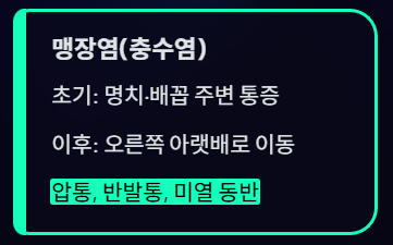 - 오른쪽아랫배통증 → 맹장염 가능성 가장 높음