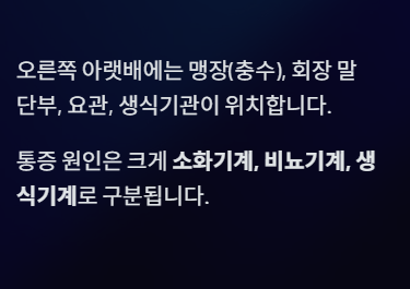 - 왼쪽아랫배통증 → 대장 질환, 여성 생식기 질환 가능성 높음