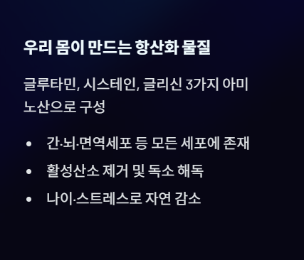 글루타치온(Glutathione)은 우리 몸이 스스로 만들어내는 대표적인 항산화 물질로, 간·뇌·면역세포 등 거의 모든 세포에 존재합니다. 글루타민, 시스테인, 글리신이라는 세 가지 아미노산으로 구성되어 있으며, 활성산소를 제거하고 독소를 해독하는 데 핵심적인 역할을 합니다.