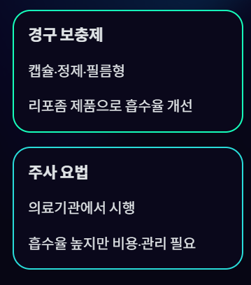 - 흡수율은 높지만 비용 부담과 의료진 관리 필요