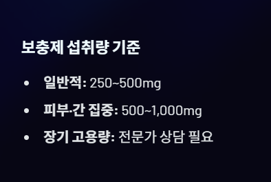 보충제 기준 일반적으로 하루 250~500mg이 많이 사용됩니다. 피부 개선이나 간 기능 보조 목적일 경우 500~1,000mg까지 섭취하는 사례도 있으나, 장기 고용량 섭취는 전문가 상담 후 결정하는 것이 안전합니다.