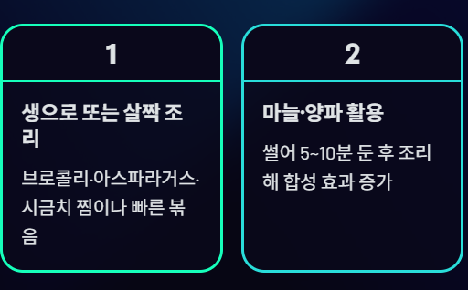 브로콜리, 아스파라거스, 시금치 등은 끓이기보다 찜이나 빠른 볶음 방식이 글루타치온 보존율이 높습니다. 샐러드로 섭취하면 가장 이상적입니다.