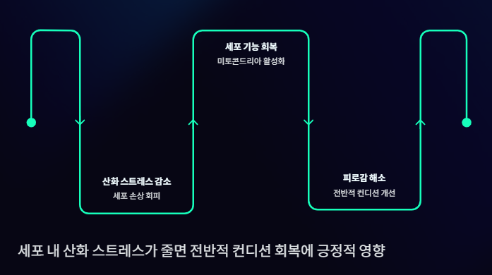세포 내 산화 스트레스가 줄어들면 전반적인 피로감 감소와 컨디션 회복에 긍정적인 영향을 줄 수 있습니다. 만성 피로를 느끼는 사람에게 기초적인 컨디션 관리 성분으로 활용됩니다.
