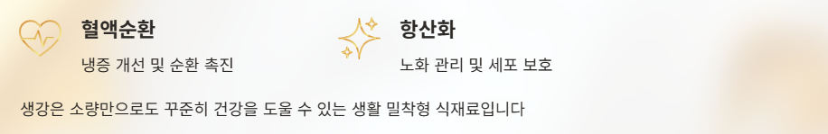 생강에는 폴리페놀 계열의 항산화 성분이 풍부해 세포 손상을 줄이고 노화 속도를 늦추는 데 도움을 줄 수 있습니다. 이는 심혈관 건강과 전반적인 건강 관리 측면에서도 긍정적인 효과로 이어질 수 있습니다.