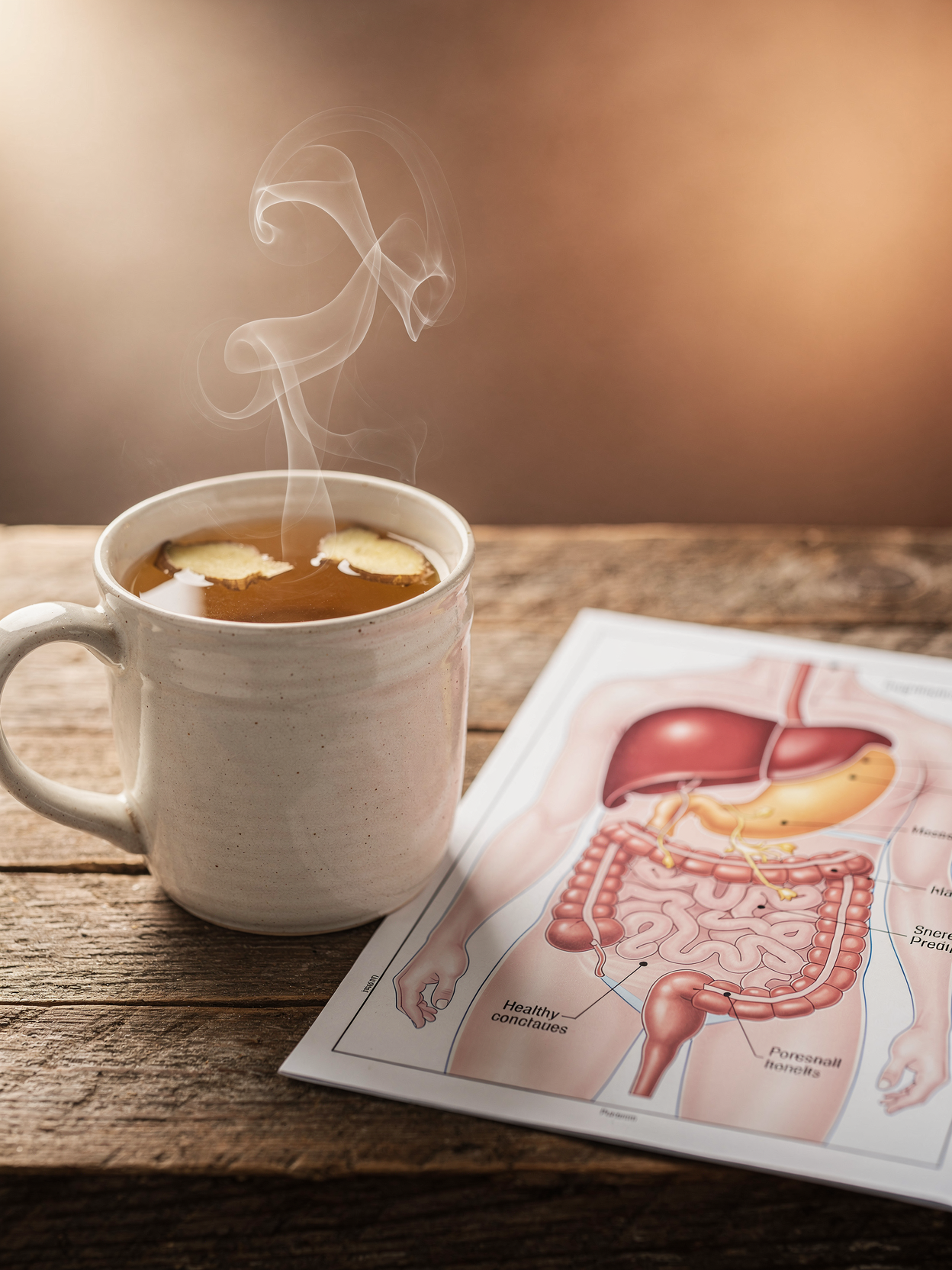 생강은 위액 분비를 촉진하고 위장 운동을 활성화해 소화불량, 복부 팽만, 메스꺼움 완화에 도움을 줍니다. 특히 식사 후 더부룩함이나 속이 울렁거릴 때 생강차를 마시면 증상이 완화되는 경우가 많습니다.