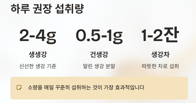 일반적으로 생강 생것 기준 하루 2~4g, 말린 생강은 0.5~1g, 생강차로는 1~2잔 정도가 무난한 섭취량으로 알려져 있습니다.