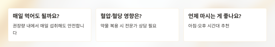 - 공복보다는 식후 또는 오후 시간대 섭취가 부담이 적습니다.