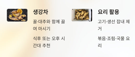 - 얇게 썬 생강을 물에 끓여 꿀이나 대추를 넣어 마시면 감기 예방·면역 관리에 좋습니다.