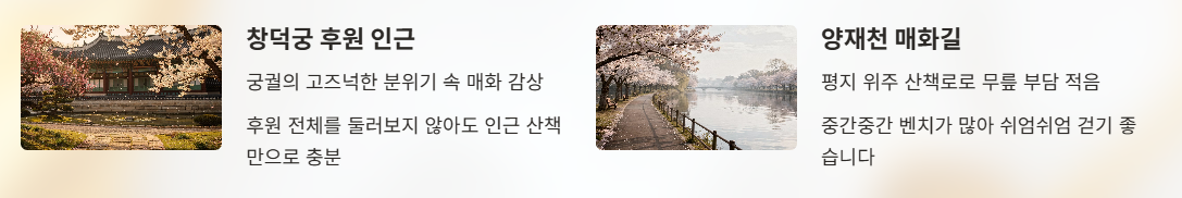 궁궐 특유의 고즈넉한 분위기 속에서 매화를 감상할 수 있는 곳이다. 후원 전체를 둘러보지 않아도, 인근 산책만으로도 충분히 만족할 수 있다.