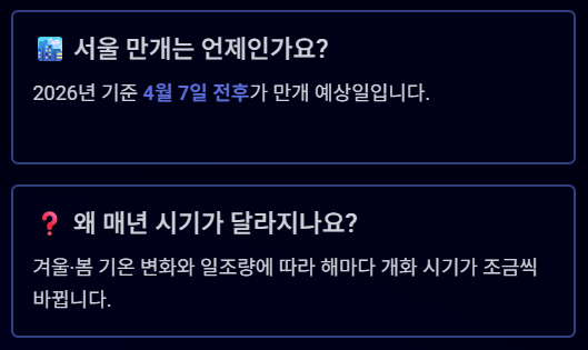 2026년 기준으로 서울 벚꽃은 4월 초 개화가 예상됩니다.