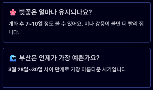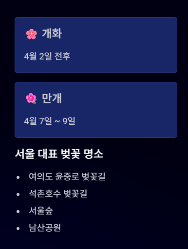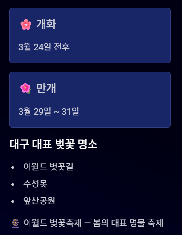 벚꽃은 자연 현상이기 때문에 기상 상황에 따라 시기가 조금씩 변할 수 있습니다.