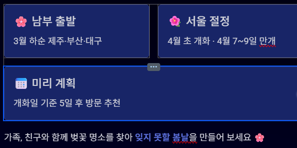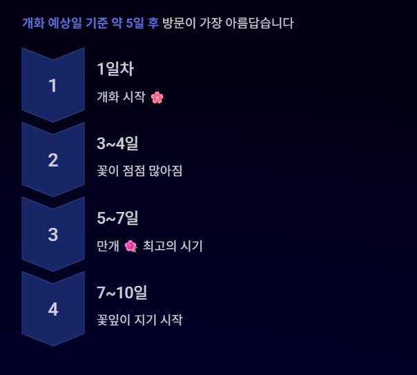 따라서 벚꽃 여행을 계획한다면 개화 예상일 기준 약 5일 후에 방문하는 것이 좋습니다.